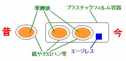 いま、町の和菓子屋さんで 栗饅頭を買うと、殆どの場合がプラスチック製のフィルムに入れられて密封されて売られています(右の絵)。 これのおかげで今、栗饅頭は平気で1ヶ月以上持ちます。