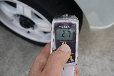 ↑ 車庫内で直射日光を浴びていないタイヤの温度は気温と同じ27℃ > ディーラーが2.0Kg/scmも入れていた空気を