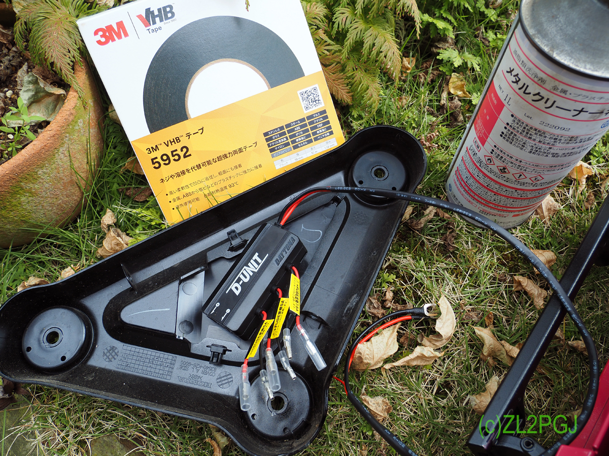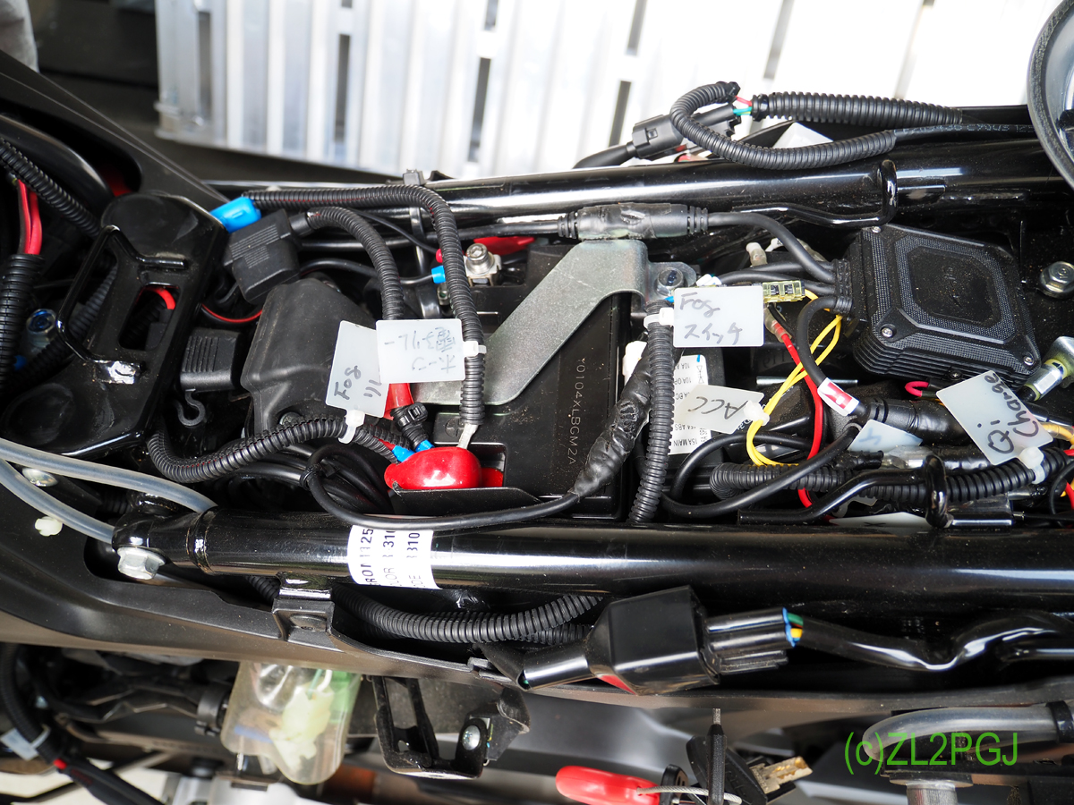 さすがにシート下のスペースはいっぱいなので、電源箱は別の場所へ。 タンクカバーの内側でも良いのですが、ヒューズが飛んだときの脱着が容易さを考えてサイドカバーの内側に3Mの5952テープで貼り付けました。