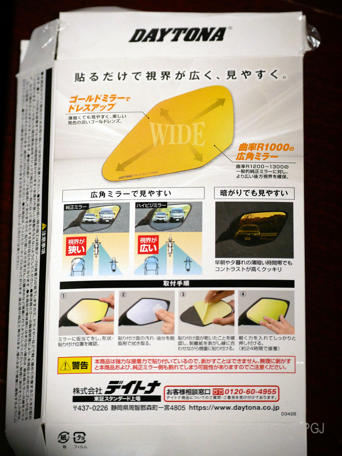 と言う理由で海外では一般的な曲面ミラーに付け替えました。 さらに、コントラストの上がる黄色にしました。 クルマの運転をするときも雨天時や薄暮時は淡黄色のサングラスをしています。 これはコントラストが上がったように見えて識別しやすくなるからです。 クレー射撃をやっていた頃に覚えた知恵です。