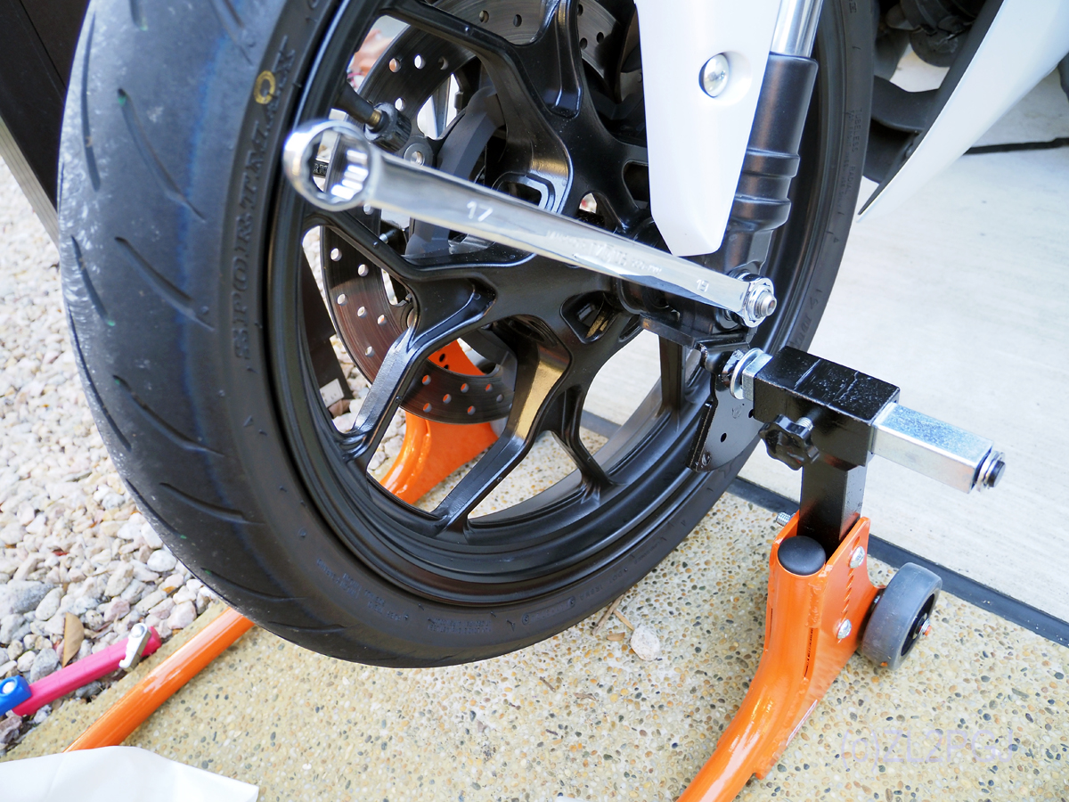 R3はマフラー触媒がエンジン下だし、カウリングがあって持っているバイク用ジャッキがかかるところが見つからん。 と言うわけで まずフロントフォーク用ジャッキを購入。