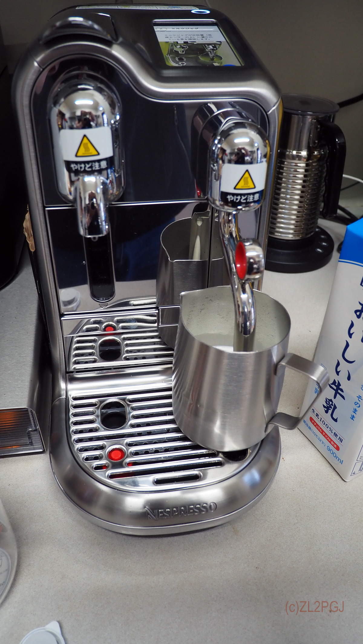 このマシンにはミルクフォーム機能がついていますが、過去のモデルはミルクフォーム作りは「ユーザーの腕次第」でしたが、このモデルはミルクジャグを置くところに温度センサーがついていてフォーム作りは自動。 お見事。 牛乳は国や産地、時期によってその性質が異なるのに、さすが乳で創業したネスレだなぁ。