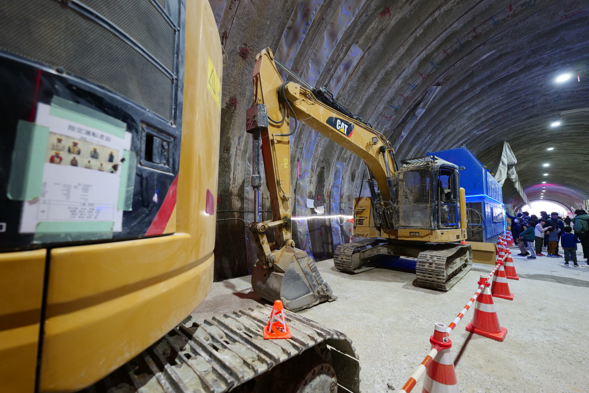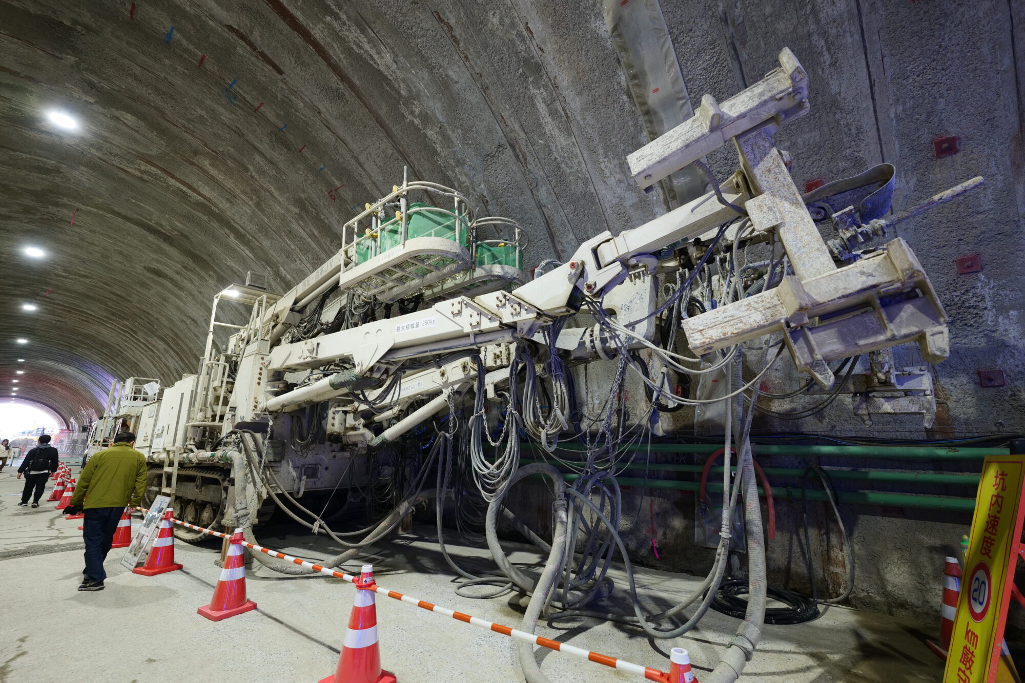多摩丘陵は基本的に硬い岩盤や断層帯があるわけではないので、左下のような重機で掘っていきまして、1m進むと切羽(掘削進行方向)に右下の重機で一度モルタルを吹いて壁を作り崩落を防ぎ、さらに壁面天井面にモルタルを吹付け、鉄鋼の枠をはめていきます。 これを毎1mやっていくのだそうで。