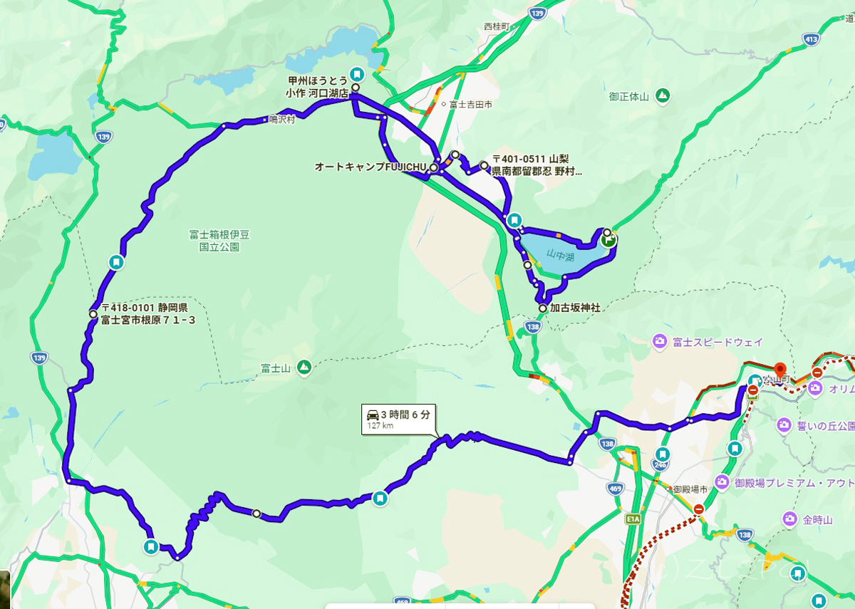 食べているうちに東富士道路が通行止めになり(三国峠は土曜から)、籠坂峠まで来たら「全面通行止めです」。 どうやら夏タイヤのおバカが団子になったらしい。 こうなると西富士を抜けて帰るしか無いので鎌倉往還を西へ。