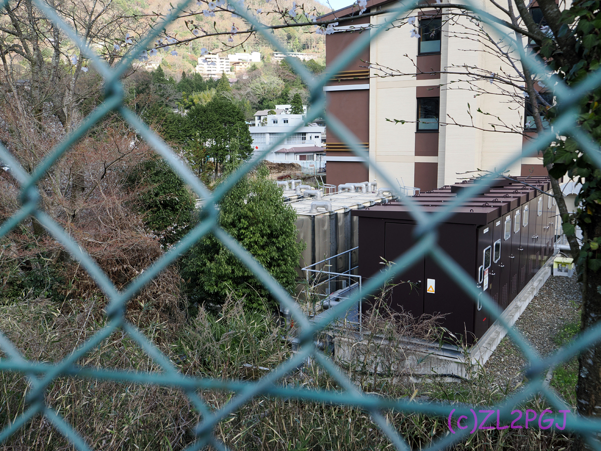 白いのが貯湯槽(ちょとうそう)、温泉のタンクです。